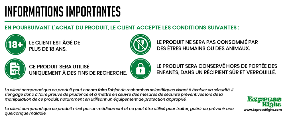 De nouvelles variétés de produits chimiques de recherche seront ajoutées à notre catalogue dans les prochaines semaines.Allemagne, Autriche, Danemark, Suède, Islande, Finlande, Norvège - Les produits chimiques de recherche ne peuvent être expédiés vers ces pays qu'en utilisant la poste aérienne régulière. La livraison de produits chimiques de recherche dans ces pays est exemptée de notre garantie de livraison et de réexpédition. Toutes les autres destinations sont couvertes et expédiées avec Fedex ou DHL.